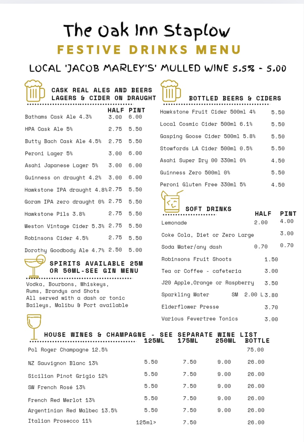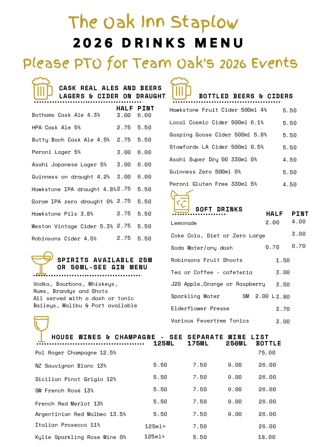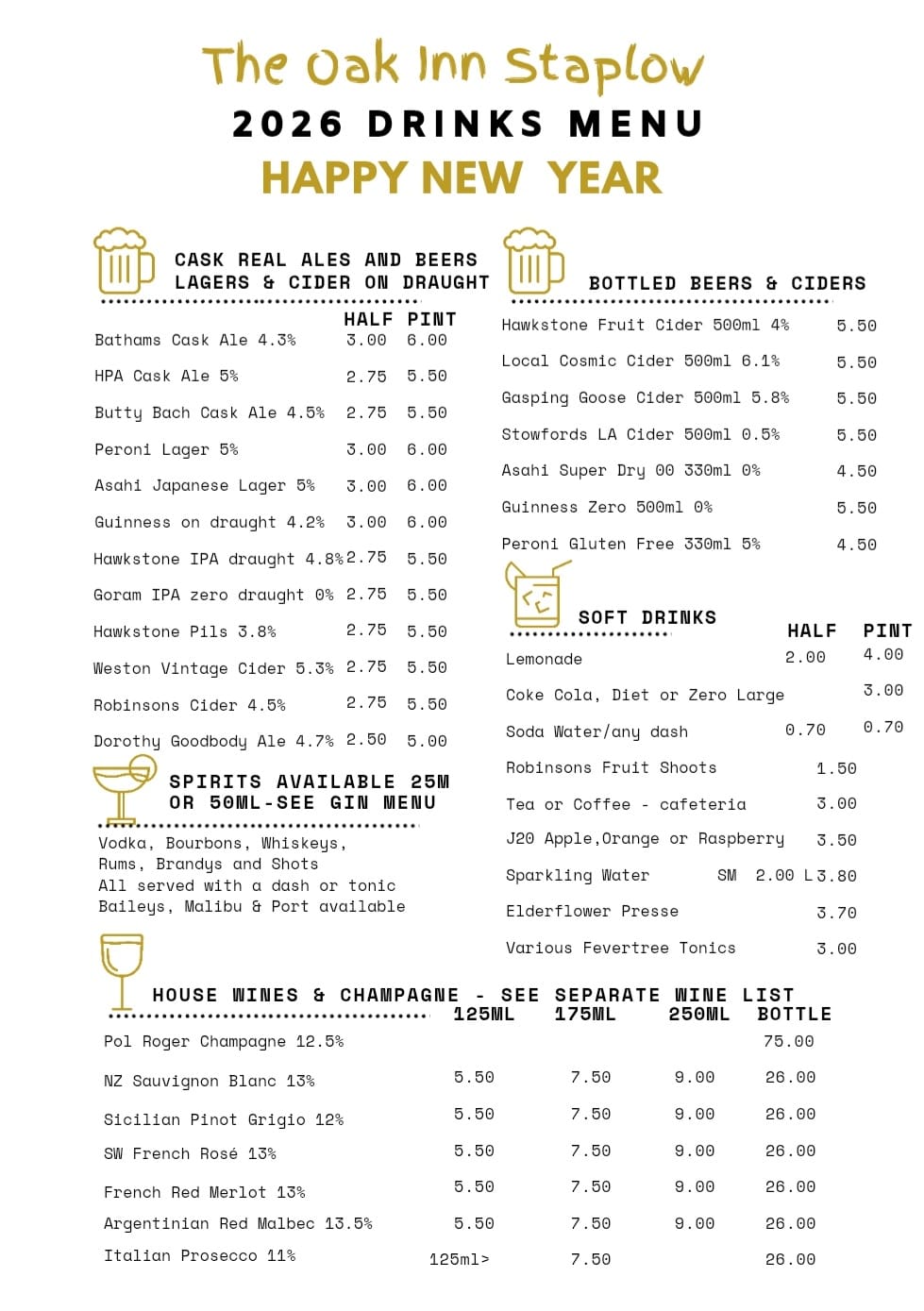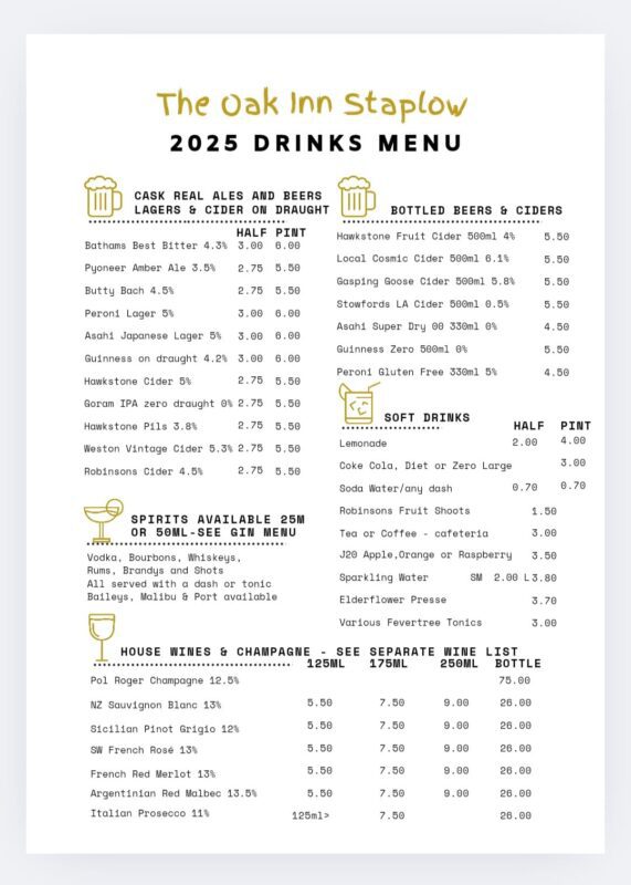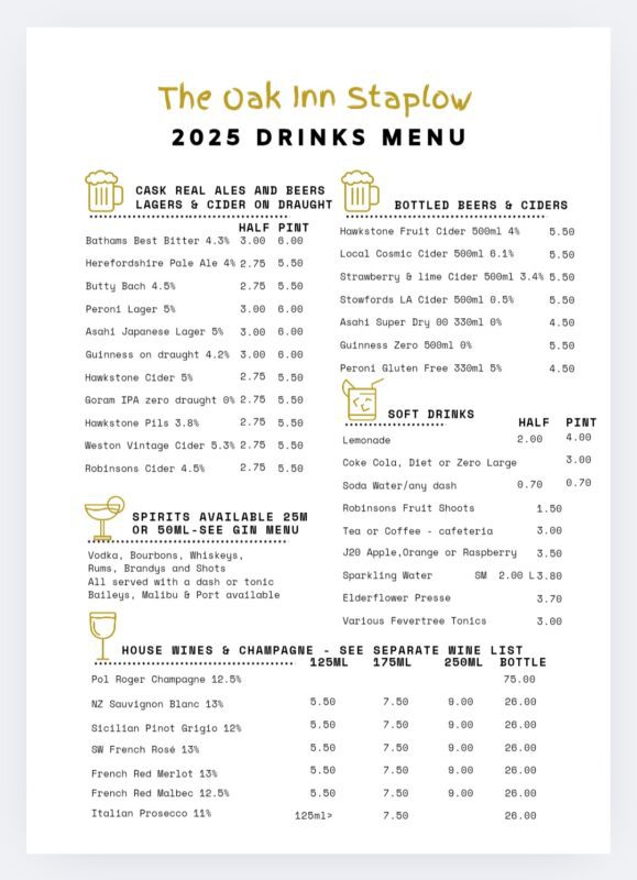 Please find our latest drinks menu below at The Oak Inn Staplow, Ledbury, Herefordshire