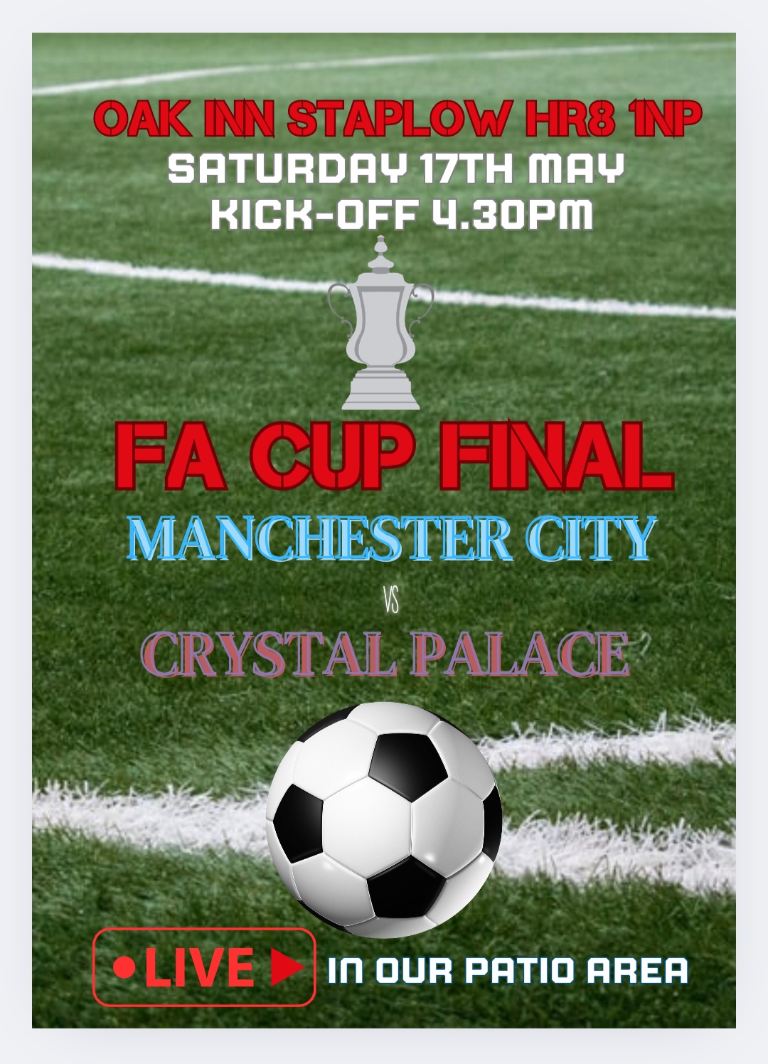 LIVE FA CUP FINAL on Saturday 17th May – Kickoff 4:30pm – Crystal Palace vs Manchester City