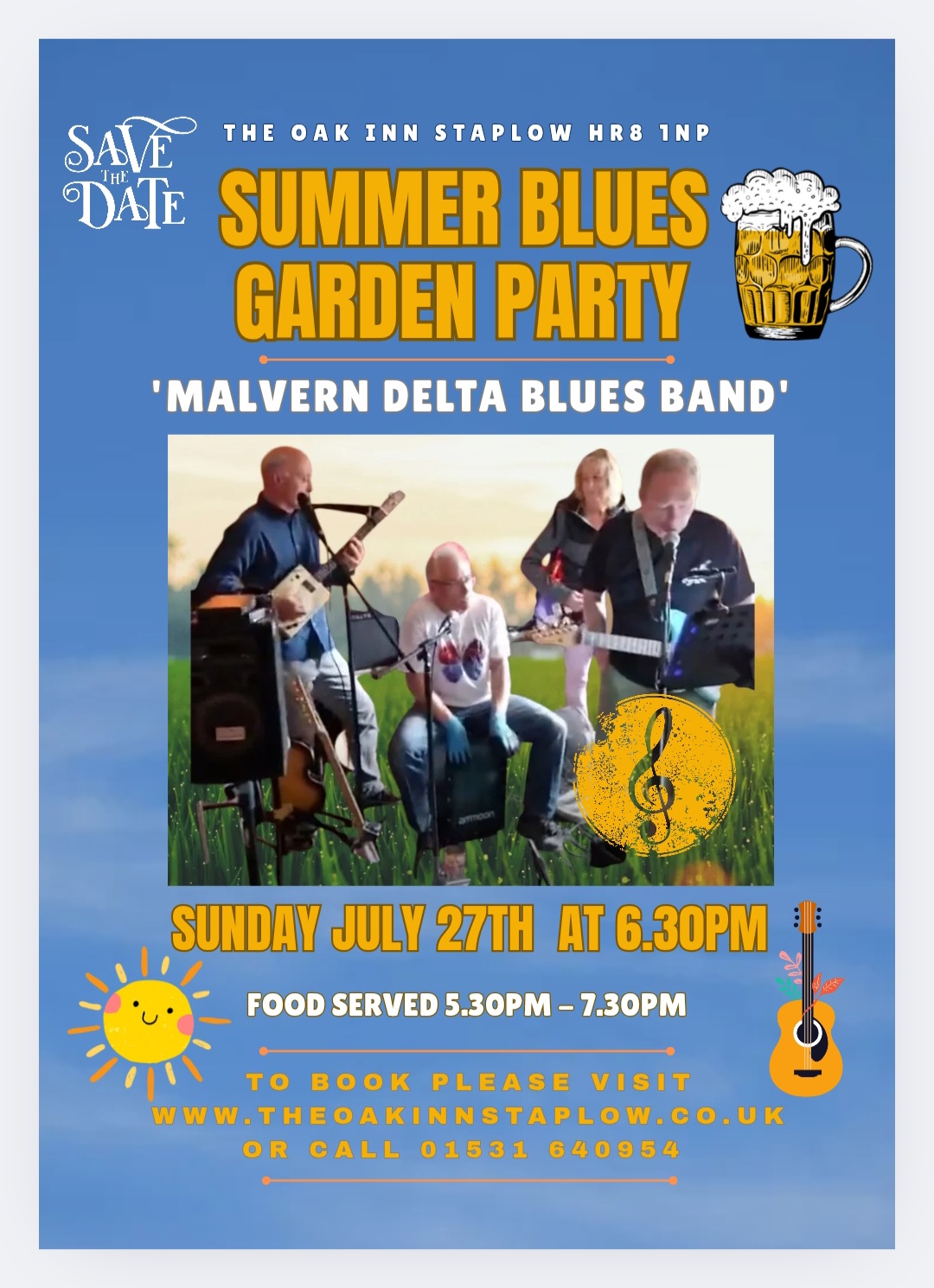 Join us for our SUMMER BLUES GARDEN PARTY featuring ‘MALVERN DELTA BLUES BAND’ on Sunday 27th July at 6.30pm. Food served from 5.30pm until 7.30pm ♥️🔥🎵🎵🎵🍔🍔🍔