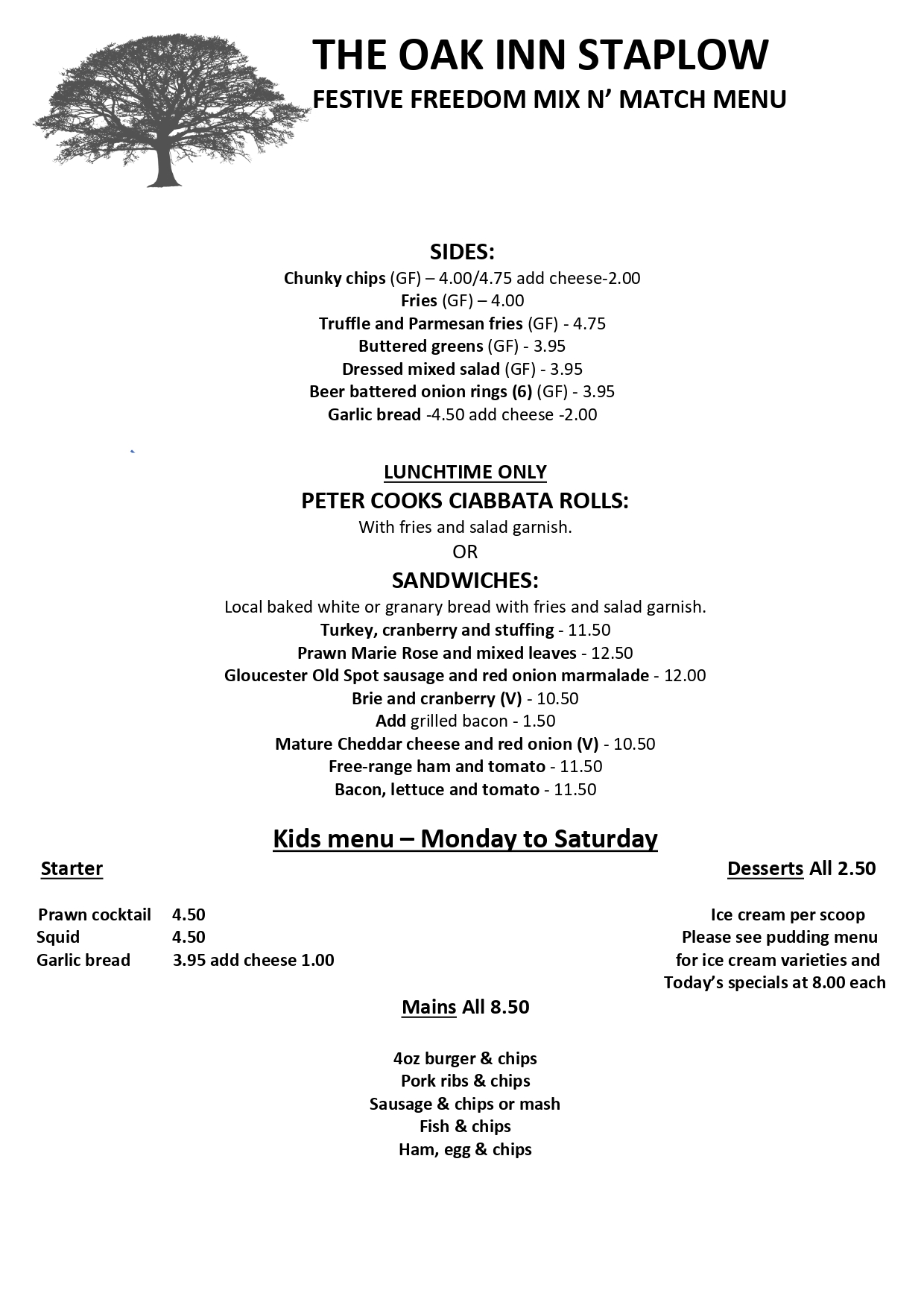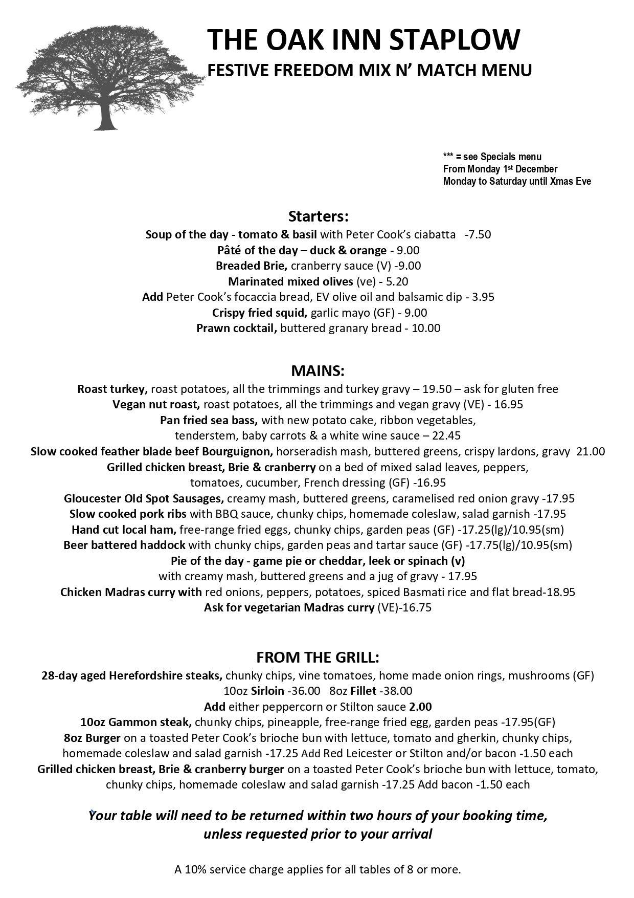 Freedom Festive Menu 2025 at The Oak Inn Staplow